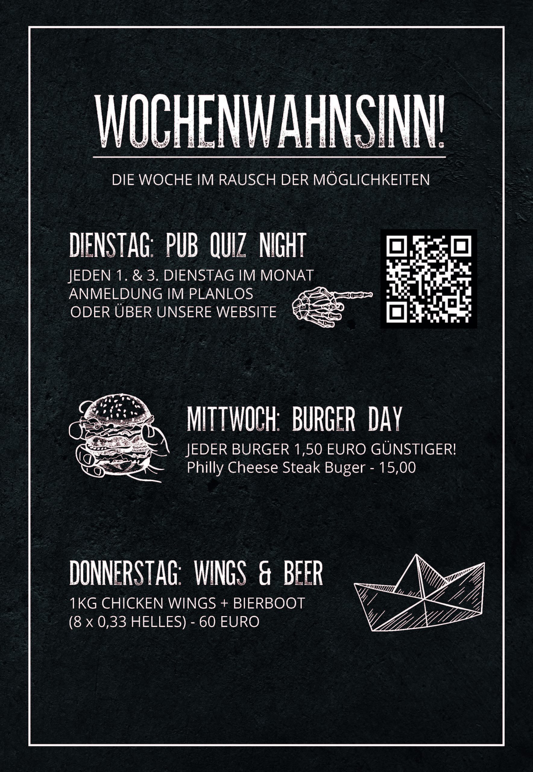 Und donnerstags gibt’s 1 kg Chicken Wings und ein Bierboot (8×0,33 l) für den perfekten Feierabend.