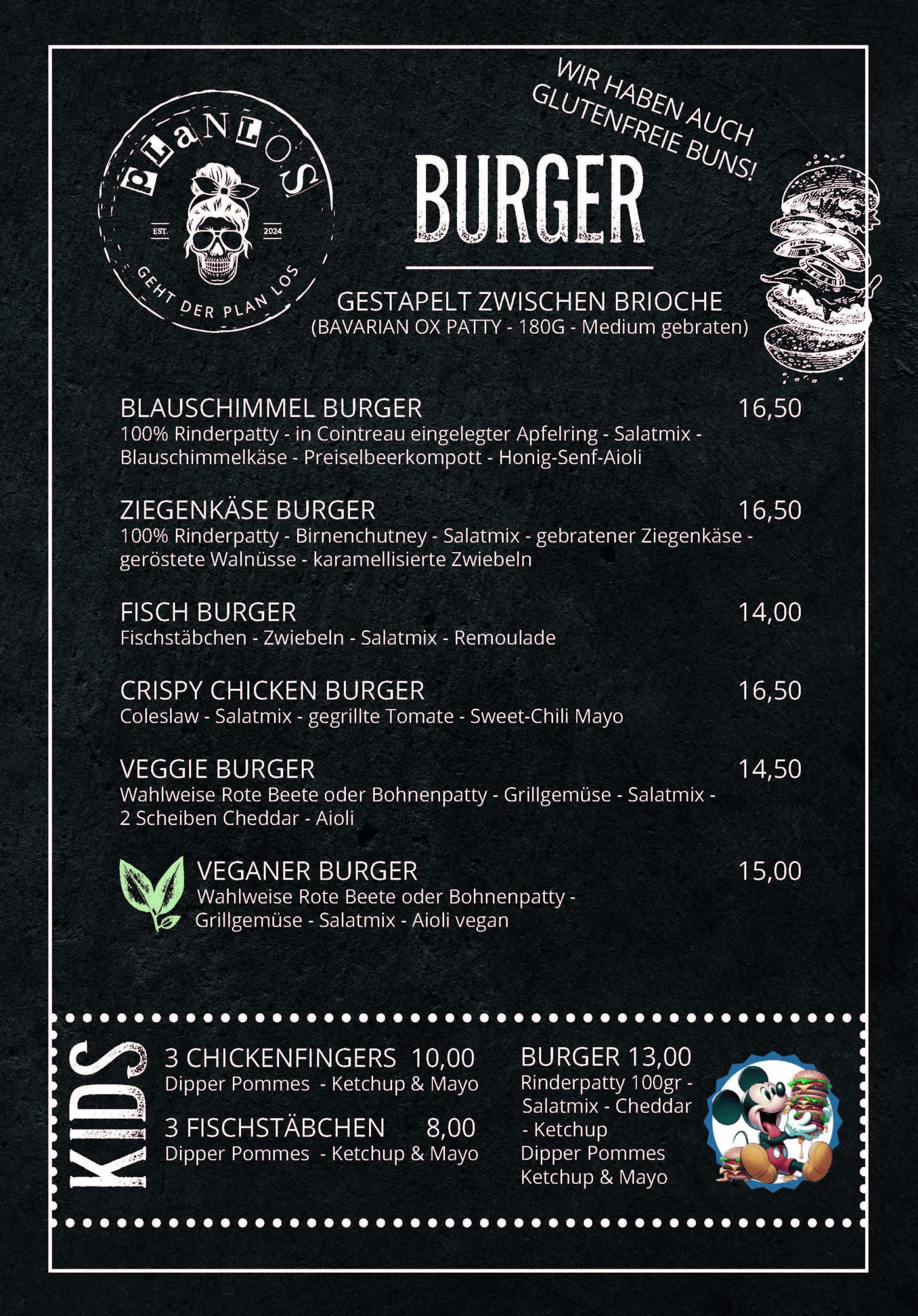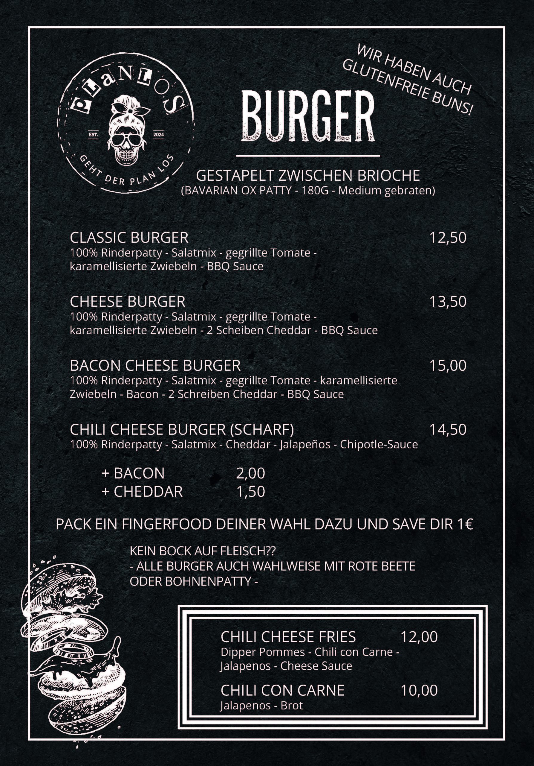 Unsere Burger-Klassiker sind echte Publikumslieblinge – saftig, frisch und immer eine gute Idee. Zu jedem Burger kannst du ein Fingerfood deiner Wahl dazubuchen und dabei 1 € auf den Fingerfood-Preis sparen. Perfekt für alle, die’s rundum lecker mögen!